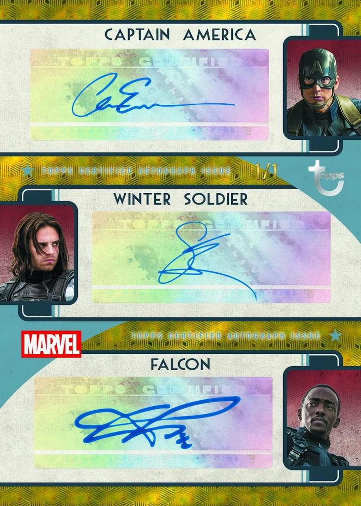 The product also honors the legacy of Captain America with original art cards depicting the different iterations of Captain America posing with the real-life Captain America statue located in his home Brooklyn, NY. In addition, be sure to look out for Marvel Studios autograph cards, comic creator autograph cards and shield die-cut sketch cards!